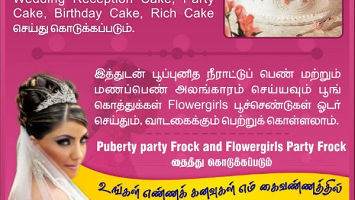 இத்துடன் பூப்புனித நீராட்டு மற்றும் மணப்பெண் அலங்காரம் செய்யவும் பூங்கொத்துக்கள் (Flowergirls), பூச்செண்டுகள் அனைத்தும் ஓடர் செய்து பெற்றுக்கொள்ளலாம். Saree Blouse, Puberty Party Frock and Flowergirls Party Frock தைத்து கொடுக்கப்படும்.