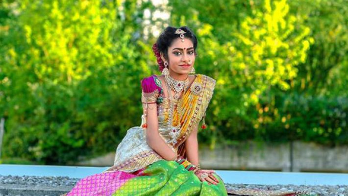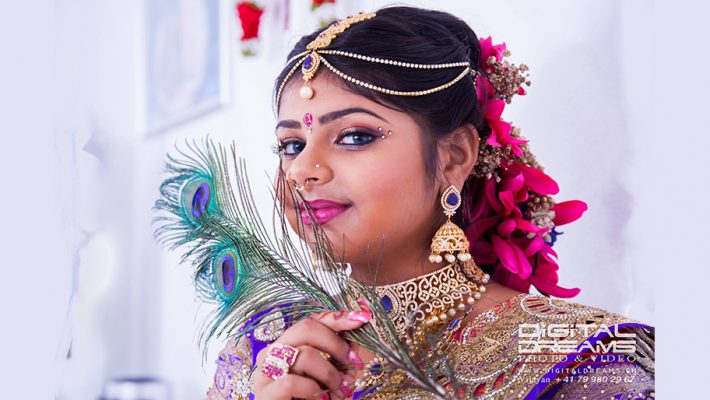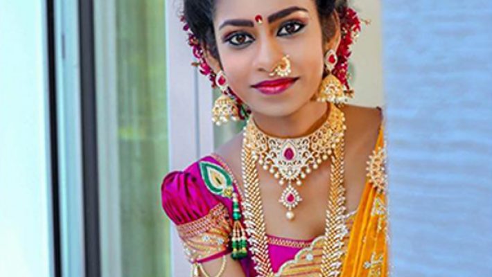 Indian bridal makeup is a lavish affair. Indian weddings are colourful. Makeup focuses on bride’s eyes. Eye brows are soft while the eye makeup is in shades of red with dark smokey outside. Bold mascara on lower eyelid brings out the bride’s beautiful features.